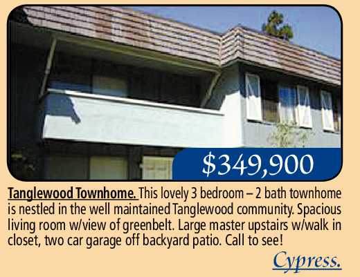 Tanglewood Townhome. This lovely 3 bedroom – 2 bath townhome is nestled in the well maintained Tanglewood community. Spacious living room w/view of greenbelt. Large master upstairs w/walk in closet, two car garage off backyard patio. Call to see!