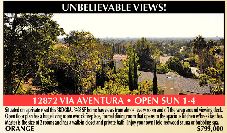 UNBELIEVABLE VIEWS! 12872 VIA AVENTURA • OPEN SUN 1-4 Situated on a private road this 3BD/3BA, 3408 SF home has views from almost every room and off the wrap around viewing deck. Open floor plan has a huge living room w/rock fireplace, formal dining room that opens to the spacious kitchen w/breakfast bar. Master is the size of 2 rooms and has a walk-in closet and private bath. Enjoy your own Helo redwood sauna or bubbling spa. ORANGE $799,000