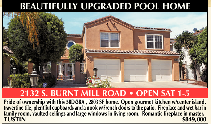 BEAUTIFULLY UPGRADED POOL HOME 2132 S. BURNT MILL ROAD • OPEN SAT 1-5 Pride of ownership with this 5BD/3BA , 2803 SF home. Open gourmet kitchen w/center island, travertine tile, plentiful cupboards and a nook w/French doors to the patio. Fireplace and wet bar in family room, vaulted ceilings and large windows in living room. Romantic fireplace in master. TUSTIN $849,000