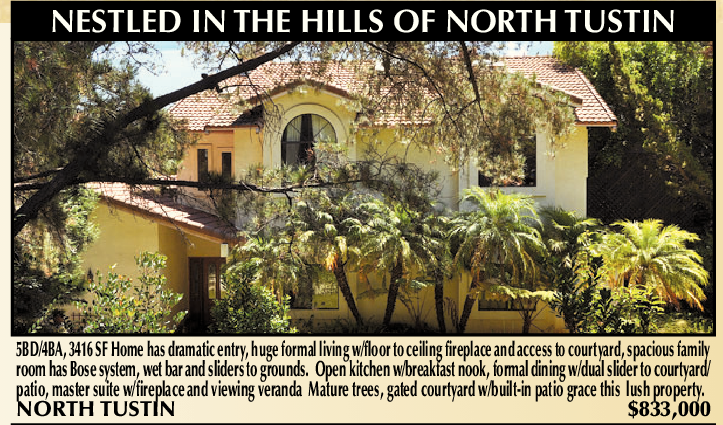 NESTLED IN THE HILLS OF NORTH TUSTIN 5BD/4BA, 3416 SF Home has dramatic entry, huge formal living w/floor to ceiling fireplace and access to courtyard, spacious family room has Bose system, wet bar and sliders to grounds. Open kitchen w/breakfast nook, formal dining w/dual slider to courtyard/ patio, master suite w/fireplace and viewing veranda Mature trees, gated courtyard w/built-in patio grace this lush property. NORTH TUSTIN $833,000