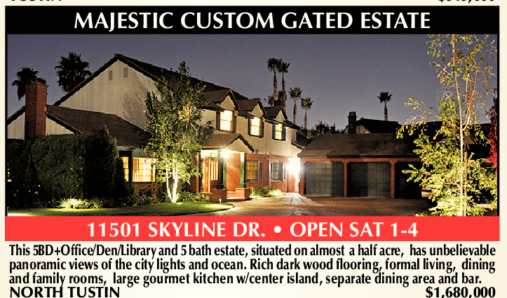 This 5BD+Office/Den/Library and 5 bath estate, situated on almost a half acre, has unbelievable panoramic views of the city lights and ocean. Rich dark wood flooring, formal living, dining and family rooms, large gourmet kitchen w/center island, separate dining area and bar. NORTH TUSTIN $1,680,000