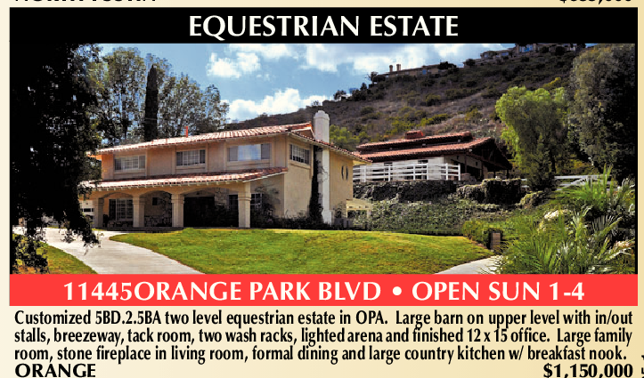 NORTH TUSTIN $833,000 EQUESTRIAN ESTATE 11445ORANGE PARK BLVD • OPEN SUN 1-4 Customized 5BD.2.5BA two level equestrian estate in OPA. Large barn on upper level with in/out stalls, breezeway, tack room, two wash racks, lighted arena and finished 12 x 15 office. Large family room, stone fireplace in living room, formal dining and large country kitchen w/ breakfast nook. ORANGE $1,150,000