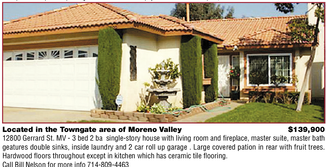 Located in the Towngate area of Moreno Valley $139,900 12800 Gerrard St. MV - 3 bed 2 ba single-story house with living room and fi replace, master suite, master bath geatures double sinks, inside laundry and 2 car roll up garage . Large covered pation in rear with fruit trees. Hardwood fl oors throughout except in kitchen which has ceramic tile fl ooring. Call Bill Nelson for more info 714-809-4463