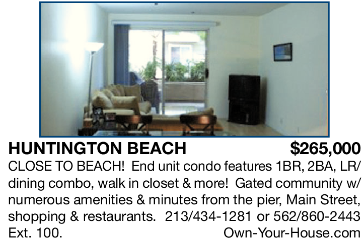 HUNTINGTON BEACH $265,000 CLOSE TO BEACH! End unit condo features 1BR, 2BA, LR/ dining combo, walk in closet & more! Gated community w/ numerous amenities & minutes from the pier, Main Street, shopping & restaurants. 213/434-1281 or 562/860-2443 Ext. 100. Own-Your-House.com