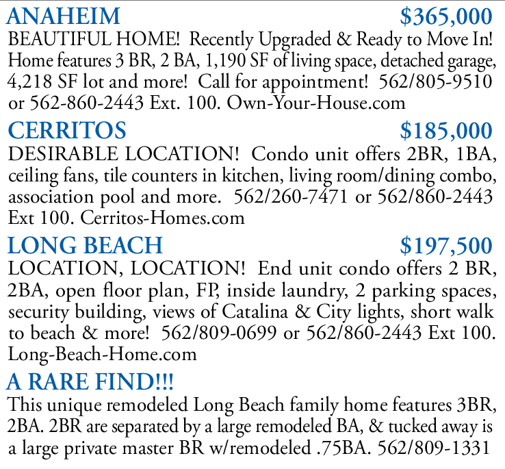 ANAHEIM $365,000 BEAUTIFUL HOME! Recently Upgraded & Ready to Move In! Home features 3 BR, 2 BA, 1,190 SF of living space, detached garage, 4,218 SF lot and more! Call for appointment! 562/805-9510 or 562-860-2443 Ext. 100. Own-Your-House.com CERRITOS $185,000 DESIRABLE LOCATION! Condo unit offers 2BR, 1BA, ceiling fans, tile counters in kitchen, living room/dining combo, association pool and more. 562/260-7471 or 562/860-2443 Ext 100. Cerritos-Homes.com LONG BEACH $197,500 LOCATION, LOCATION! End unit condo offers 2 BR, 2BA, open floor plan, FP, inside laundry, 2 parking spaces, security building, views of Catalina & City lights, short walk to beach & more! 562/809-0699 or 562/860-2443 Ext 100.