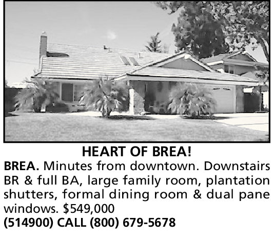 BREA. Minutes from downtown. Downstairs BR & full BA, large family room, plantation shutters, formal dining room & dual pane windows. $549,000 (514900) CALL (800) 679-5678