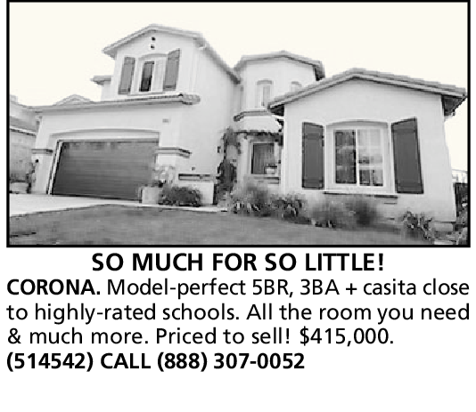 CORONA. Model-perfect 5BR, 3BA + casita close to highly-rated schools. All the room you need & much more. Priced to sell! $415,000. (514542) CALL (888) 307-0052