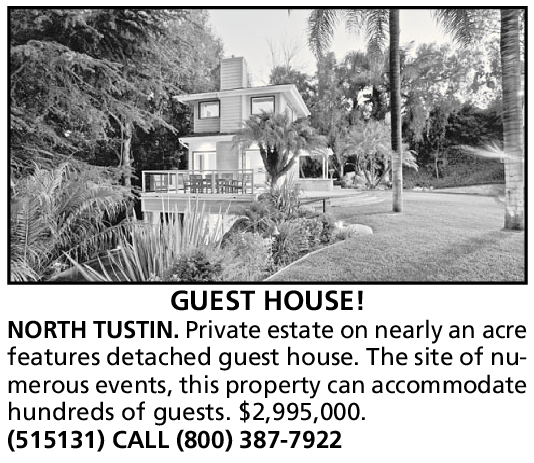 NORTH TUSTIN. Private estate on nearly an acre features detached guest house. The site of numerous events, this property can accommodate hundreds of guests. $2,995,000. (515131) CALL (800) 387-7922