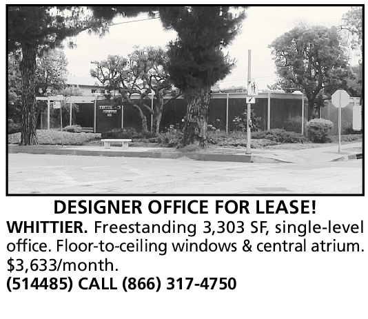 WHITTIER. Freestanding 3,303 SF, single-level office. Floor-to-ceiling windows & central atrium. $3,633/month. (514485) CALL (866) 317-4750