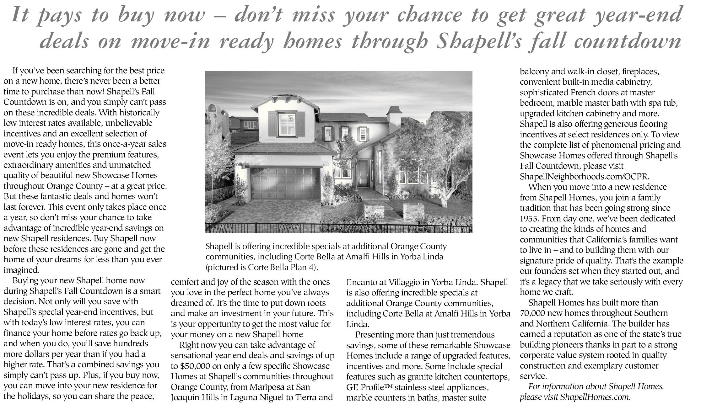 comfort and joy of the season with the ones you love in the perfect home you’ve always dreamed of. It’s the time to put down roots and make an investment in your future. This is your opportunity to get the most value for your money on a new Shapell home Right now you can take advantage of sensational year-end deals and savings of up to $50,000 on only a few specific Showcase Homes at Shapell’s communities throughout Orange County, from Mariposa at San Joaquin Hills in Laguna Niguel to Tierra and