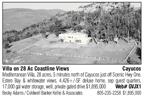 Villa on 28 Ac Coastline Views Cayucos Mediterranean Villa, 28 acres, 5 minutes north of Cayucos just off Scenic Hwy One. Estero Bay & whitewater views, 4,426+/-SF deluxe home, sep guest quarters, 17,000 gal water storage, well, private gated drive $1,895,000 Web# GVJX1 Becky Adams / Coldwell Banker Kellie & Associates 805-235-2258 $1,895,000
