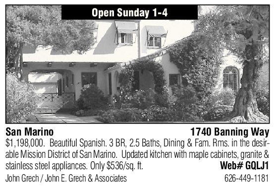 San Marino 1740 Banning Way $1,198,000. Beautiful Spanish. 3 BR, 2.5 Baths, Dining & Fam. Rms. in the desirable Mission District of San Marino. Updated kitchen with maple cabinets, granite & stainless steel appliances. Only $536/sq. ft. Web# GQLJ1 John Grech / John E. Grech & Associates 626-449-1181