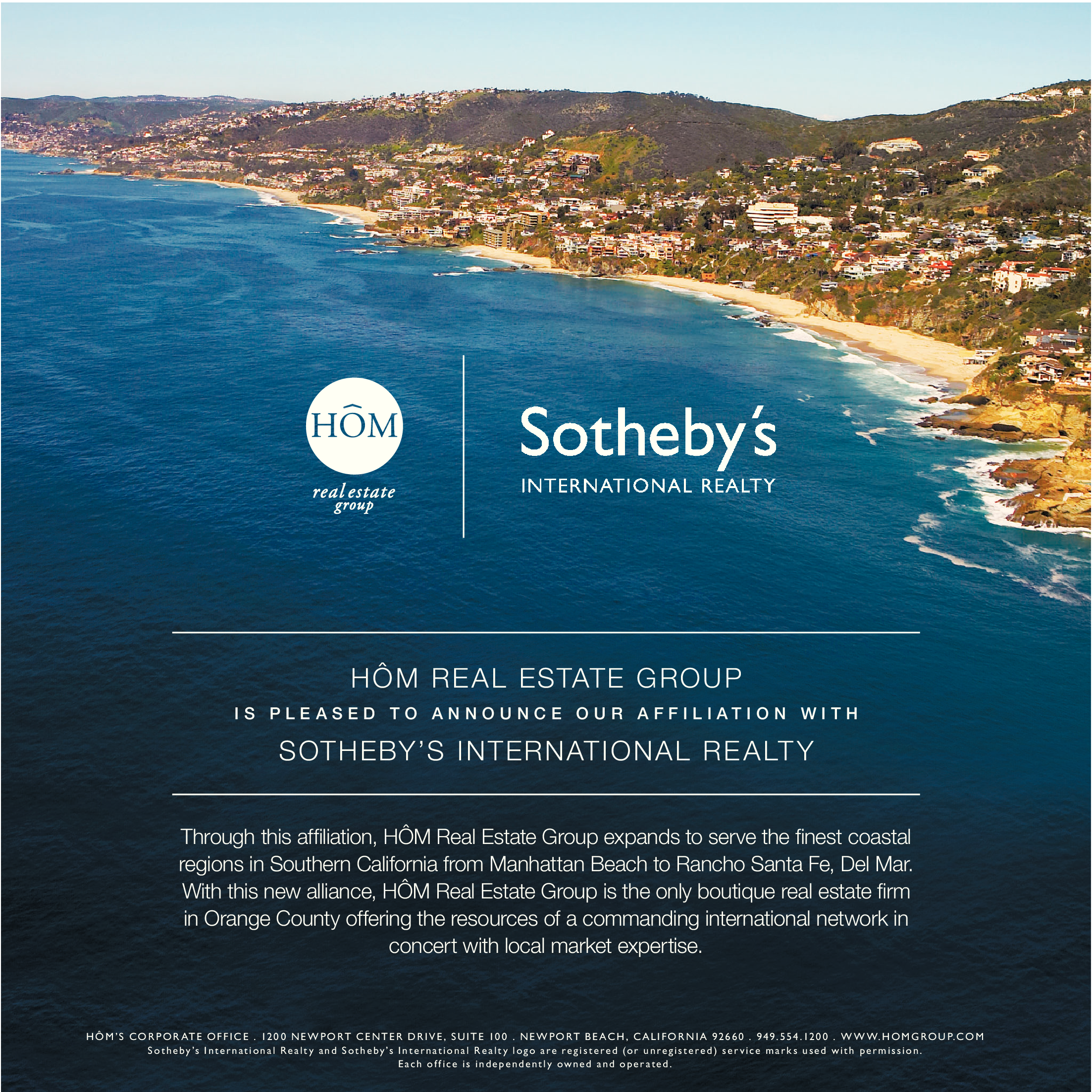 HÔM RE AL ESTATE GROUP I S P L E A S E D T O A N N O U N C E O U R A F F I L I A T I O N W I T H SOTHEBY’S INTERNATIONAL RE ALT Y Through this affiliation, HÔM Real Estate Group expands to serve the finest coastal regions in Southern California from Manhattan Beach to Rancho Santa Fe, Del Mar. With this new alliance, HÔM Real Estate Group is the only boutique real estate firm in Orange County offering the resources of a commanding international network in concert with local market expertise. HÔM’S CORPORATE OFFICE . 1200 NEWPORT CENTER DRIVE, SUITE 100 . NEWPORT BEACH, CALIFORNIA 92660 . 949.554.1200 . WWW.HOMGROUP.COM Sotheby’s International Realty and Sotheby’s International Realty logo are registered (or unregistered) service marks used with permission. Each office is independently owned and operated.