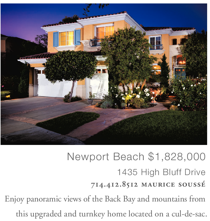 Newport Beach $1,828,000 1435 High Bluff Drive 714.412.8512 maurice soussé Enjoy panoramic views of the Back Bay and mountains from this upgraded and turnkey home located on a cul-de-sac.