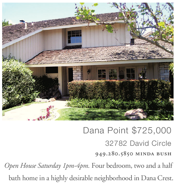 Dana Point $725,000 32782 David Circle 949.280.5850 minda bush Open House Saturday 1pm-4pm. Four bedroom, two and a half bath home in a highly desirable neighborhood in Dana Crest.