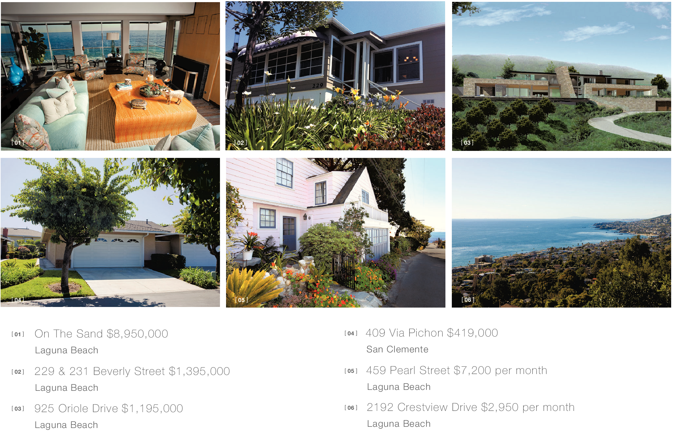 [ 01 ] [ 02 ] [ 03 ] [ 04 ] [ 05 ] [ 06 ] [ 01 ] [ 02 ] [ 03 ] On The Sand $8,950,000 Laguna Beach 229 & 231 Beverly Street $1,395,000 Laguna Beach 925 Oriole Drive $1,195,000 Laguna Beach [ 04 ] [ 05 ] [ 06 ] 409 Via Pichon $419,000 San Clemente 459 Pearl Street $7,200 per month Laguna Beach 2192 Crestview Drive $2,950 per month Laguna Beach See also