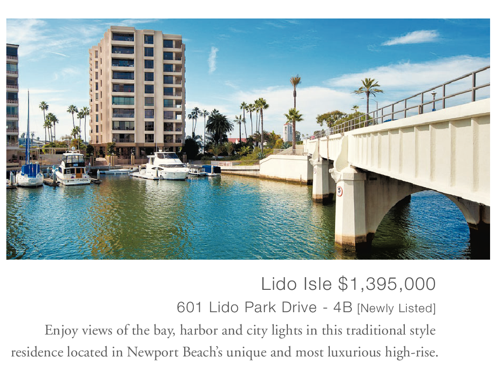 Lido Isle $1,395,000 601 Lido Park Drive - 4B [Newly Listed] Enjoy views of the bay, harbor and city lights in this traditional style residence located in Newport Beach’s unique and most luxurious high-rise.