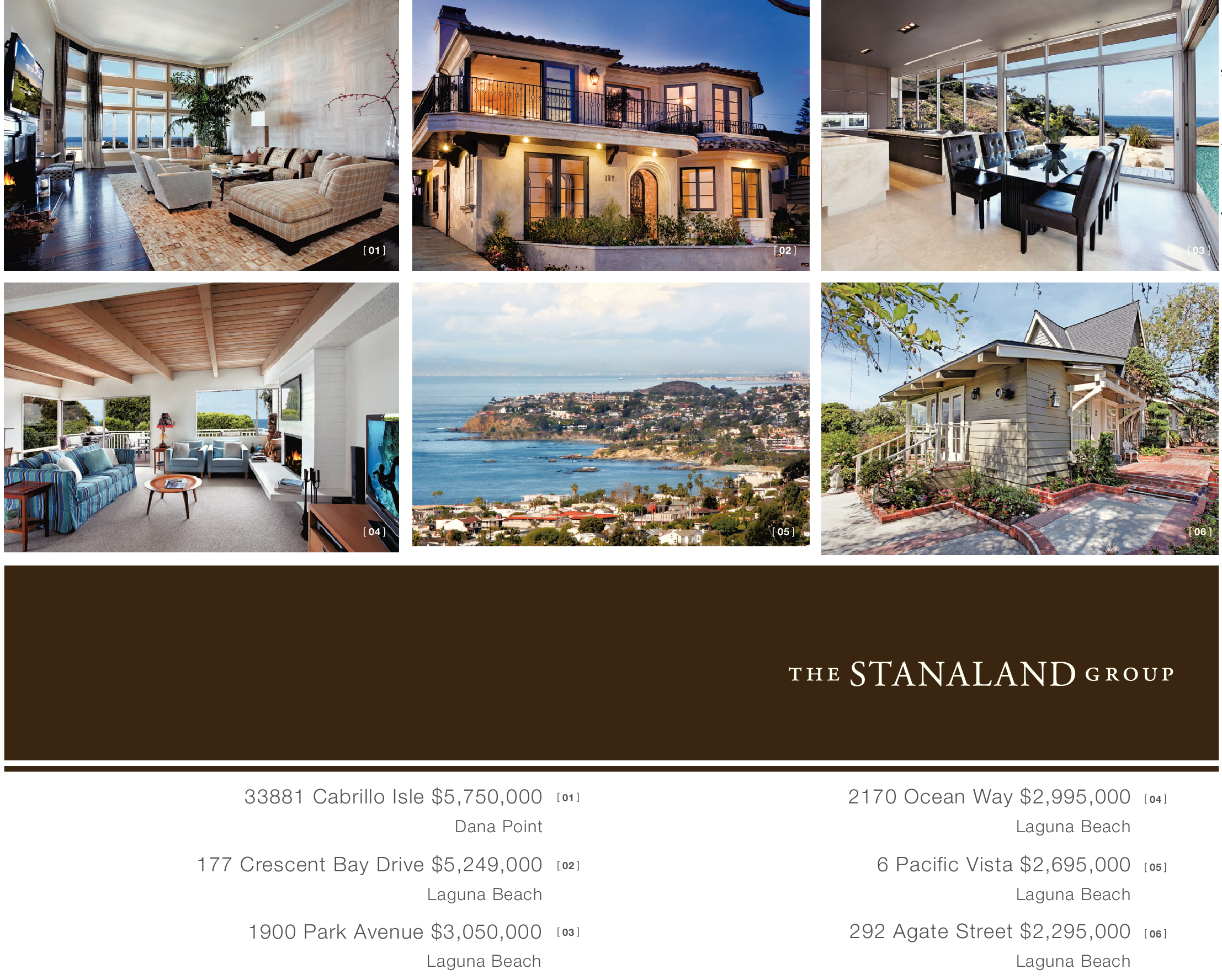 [ 01 ] [ 02 ] [ 04 ] [ 05 ] 33881 Cabrillo Isle $5,750,000 Dana Point 177 Crescent Bay Drive $5,249,000 Laguna Beach 1900 Park Avenue $3,050,000 Laguna Beach [ 01 ] [ 02 ] [ 03 ] 2170 Ocean Way $2,995,000 Laguna Beach 6 Pacific Vista $2,695,000 Laguna Beach 292 Agate Street $2,295,000 Laguna Beach [ 04 ] [ 05 ] [ 06 ] [ 03 ] [ 06 ]