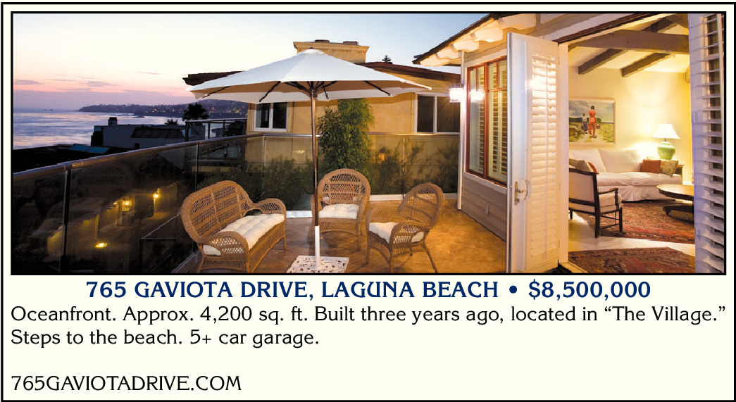 765 GAVIOTA DRIVE, LAGUNA BEACH • $8,500,000 Oceanfront. Approx. 4,200 sq. ft. Built three years ago, located in “The Village.” Steps to the beach. 5+ car garage.
