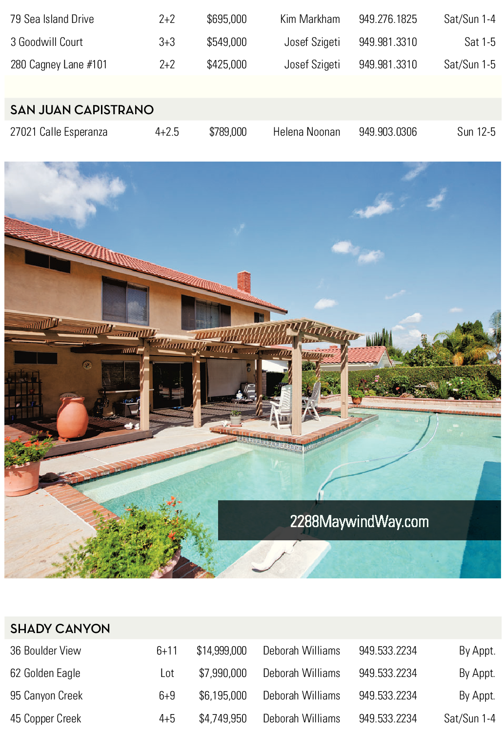 79 Sea Island Drive 2+2 $695,000 Kim Markham 949.276.1825 Sat/Sun 1-4 3 Goodwill Court 3+3 $549,000 Josef Szigeti 949.981.3310 Sat 1-5 280 Cagney Lane #101 2+2 $425,000 Josef Szigeti 949.981.3310 Sat/Sun 1-5