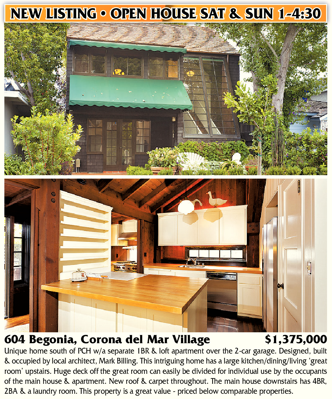 NEW LISTING • OPEN HOUSE SAT & SUN 1-4:30 604 Begonia, Corona del Mar Village $1,375,000 Unique home south of PCH w/a separate 1BR & loft apartment over the 2-car garage. Designed, built & occupied by local architect, Mark Billing. This intriguing home has a large kitchen/dining/living ‘great room’ upstairs. Huge deck off the great room can easily be divided for individual use by the occupants of the main house & apartment. New roof & carpet throughout. The main house downstairs has 4BR, 2BA & a laundry room. This property is a great value - priced below comparable properties.