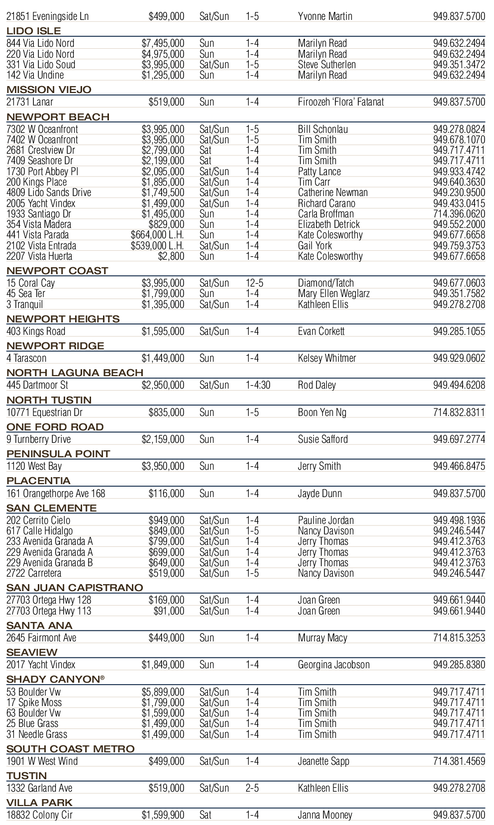 21851 Eveningside Ln $499,000 Sat/Sun 1-5 Yvonne Martin 949.837.5700 LIDO ISLE 844 Via Lido Nord $7,495,000 Sun 1-4 Marilyn Read 949.632.2494 220 Via Lido Nord $4,975,000 Sun 1-4 Marilyn Read 949.632.2494 331 Via Lido Soud $3,995,000 Sat/Sun 1-5 Steve Sutherlen 949.351.3472 142 Via Undine $1,295,000 Sun 1-4 Marilyn Read 949.632.2494 MISSION VIEJO 21731 Lanar $519,000 Sun 1-4 Firoozeh ‘Flora’ Fatanat 949.837.5700 NEWPORT BEACH 7302 W Oceanfront $3,995,000 Sat/Sun 1-5 Bill Schonlau 949.278.0824 7402 W Oceanfront $3,995,000 Sat/Sun 1-5 Tim Smith 949.678.1070 2681 Crestview Dr $2,799,000 Sat 1-4 Tim Smith 949.717.4711 7409 Seashore Dr $2,199,000 Sat 1-4 Tim Smith 949.717.4711 1730 Port Abbey Pl $2,095,000 Sat/Sun 1-4 Patty Lance 949.933.4742 200 Kings Place $1,895,000 Sat/Sun 1-4 Tim Carr 949.640.3630 4809 Lido Sands Drive $1,749,500 Sat/Sun 1-4 Catherine Newman 949.230.9500 2005 Yacht Vindex $1,499,000 Sat/Sun 1-4 Richard Carano 949.433.0415 1933 Santiago Dr $1,495,000 Sun 1-4 Carla Broffman 714.396.0620 354 Vista Madera $829,000 Sun 1-4 Elizabeth Detrick 949.552.2000 441 Vista Parada $664,000 L.H. Sun 1-4 Kate Colesworthy 949.677.6658 2102 Vista Entrada $539,000 L.H. Sat/Sun 1-4 Gail York 949.759.3753 2207 Vista Huerta $2,800 Sun 1-4 Kate Colesworthy 949.677.6658 NEWPORT COAST 15 Coral Cay $3,995,000 Sat/Sun 12-5 Diamond/Tatch 949.677.0603 45 Sea Ter $1,799,000 Sun 1-4 Mary Ellen Weglarz 949.351.7582 3 Tranquil $1,395,000 Sat/Sun 1-4 Kathleen Ellis 949.278.2708 NEWPORT HEIGHTS 403 Kings Road $1,595,000 Sat/Sun 1-4 Evan Corkett 949.285.1055 NEWPORT RIDGE 4 Tarascon $1,449,000 Sun 1-4 Kelsey Whitmer 949.929.0602 NORTH LAGUNA BEACH 445 Dartmoor St $2,950,000 Sat/Sun 1-4:30 Rod Daley 949.494.6208 NORTH TUSTIN 10771 Equestrian Dr $835,000 Sun 1-5 Boon Yen Ng 714.832.8311 ONE FORD ROAD 9 Turnberry Drive $2,159,000 Sun 1-4 Susie Safford 949.697.2774 PENINSULA POINT 1120 West Bay $3,950,000 Sun 1-4 Jerry Smith 949.466.8475 PLACENTIA 161 Orangethorpe Ave 168 $116,000 Sun 1-4 Jayde Dunn 949.837.5700 SAN CLEMENTE 202 Cerrito Cielo $949,000 Sat/Sun 1-4 Pauline Jordan 949.498.1936 617 Calle Hidalgo $849,000 Sat/Sun 1-5 Nancy Davison 949.246.5447 233 Avenida Granada A $799,000 Sat/Sun 1-4 Jerry Thomas 949.412.3763 229 Avenida Granada A $699,000 Sat/Sun 1-4 Jerry Thomas 949.412.3763 229 Avenida Granada B $649,000 Sat/Sun 1-4 Jerry Thomas 949.412.3763 2722 Carretera $519,000 Sat/Sun 1-5 Nancy Davison 949.246.5447 SAN JUAN CAPISTRANO 27703 Ortega Hwy 128 $169,000 Sat/Sun 1-4 Joan Green 949.661.9440 27703 Ortega Hwy 113 $91,000 Sat/Sun 1-4 Joan Green 949.661.9440 SANTA ANA 2645 Fairmont Ave $449,000 Sun 1-4 Murray Macy 714.815.3253 SEAVIEW 2017 Yacht Vindex $1,849,000 Sun 1-4 Georgina Jacobson 949.285.8380 SHADY CANYON ® 53 Boulder Vw $5,899,000 Sat/Sun 1-4 Tim Smith 949.717.4711 17 Spike Moss $1,799,000 Sat/Sun 1-4 Tim Smith 949.717.4711 63 Boulder Vw $1,599,000 Sat/Sun 1-4 Tim Smith 949.717.4711 25 Blue Grass $1,499,000 Sat/Sun 1-4 Tim Smith 949.717.4711 31 Needle Grass $1,499,000 Sat/Sun 1-4 Tim Smith 949.717.4711 SOUTH COAST METRO 1901 W West Wind $499,000 Sat/Sun 1-4 Jeanette Sapp 714.381.4569 TUSTIN 1332 Garland Ave $519,000 Sat/Sun 2-5 Kathleen Ellis 949.278.2708 VILLA PARK 18832 Colony Cir $1,599,900 Sat 1-4 Janna Mooney 949.837.5700