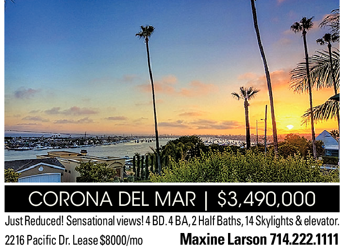 Just Reduced! Sensational views! 4 BD. 4 BA, 2 Half Baths, 14 Skylights & elevator. 2216 Pacific Dr. Lease $8000/mo Maxine Larson 714.222.1111