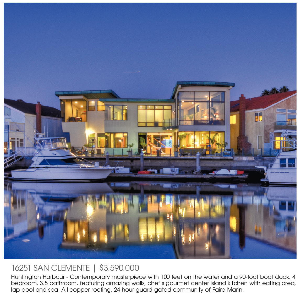 16251 SAN CLEMENTE | $3,590,000 Huntington Harbour - Contemporary masterpiece with 100 feet on the water and a 90-foot boat dock. 4 bedroom, 3.5 bathroom, featuring amazing walls, chef’s gourmet center island kitchen with eating area, lap pool and spa. All copper roofing. 24-hour guard-gated community of Faire Marin.