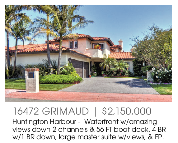 16472 GRIMAUD | $2,150,000 Huntington Harbour - Waterfront w/amazing views down 2 channels & 56 FT boat dock. 4 BR w/1 BR down, large master suite w/views, & FP.