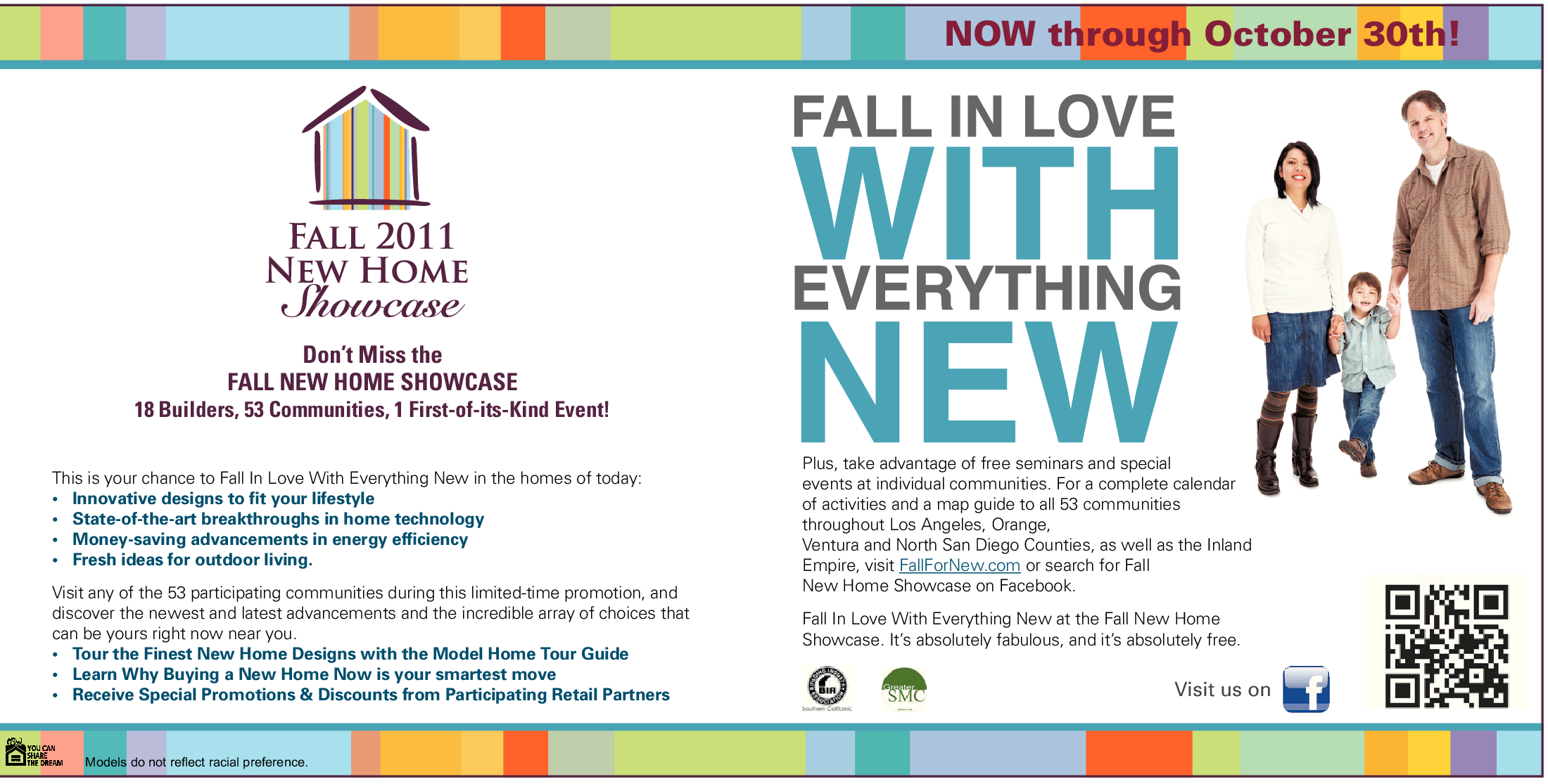 Don’t Miss the FALL NEW HOME SHOWCASE 18 Builders, 53 Communities, 1 First-of-its-Kind Event! This is your chance to Fall In Love With Everything New in the homes of today: • Innovative designs to fit your lifestyle • State-of-the-art breakthroughs in home technology • Money-saving advancements in energy efficiency • Fresh ideas for outdoor living. Visit any of the 53 participating communities during this limited-time promotion, and discover the newest and latest advancements and the incredible array of choices that can be yours right now near you. • Tour the Finest New Home Designs with the Model Home Tour Guide • Learn Why Buying a New Home Now is your smartest move • Receive Special Promotions & Discounts from Participating Retail Partners Models do not reflect racial preference. NOW through October 30th! Plus, take advantage of free seminars and special events at individual communities. For a complete calendar of activities and a map guide to all 53 communities throughout Los Angeles, Orange, Ventura and North San Diego Counties, as well as the Inland Empire, visit FallForNew.com or search for Fall New Home Showcase on Facebook. Fall In Love With Everything New at the Fall New Home Showcase. It’s absolutely fabulous, and it’s absolutely free. Visit us on