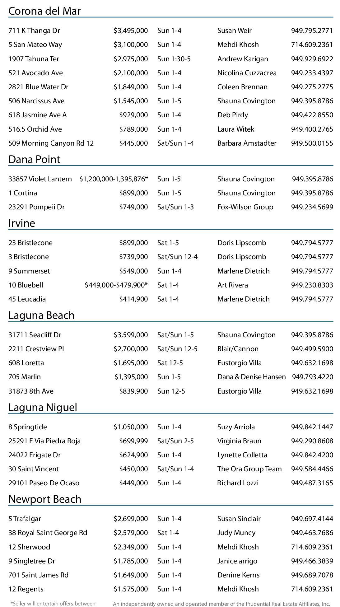 31711 Seacliff Dr $3,599,000 Sat/Sun 1-5 Shauna Covington 949.395.8786 2211 Crestview Pl $2,700,000 Sat/Sun 12-5 Blair/Cannon 949.499.5900 608 Loretta $1,695,000 Sat 12-5 Eustorgio Villa 949.632.1698 705 Marlin $1,395,000 Sun 1-5 Dana & Denise Hansen 949.793.4220 31873 8th Ave $839,900 Sun 12-5 Eustorgio Villa 949.632.1698