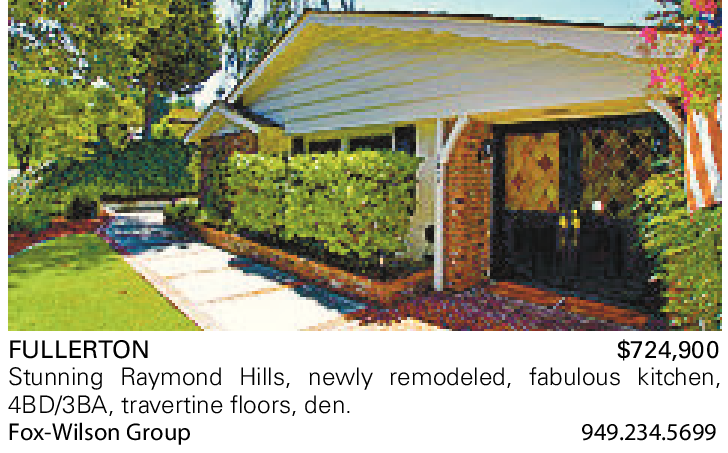 FULLERTON $724,900 Stunning Raymond Hills, newly remodeled, fabulous kitchen, 4BD/3BA, travertine floors, den. Fox-Wilson Group 949.234.5699