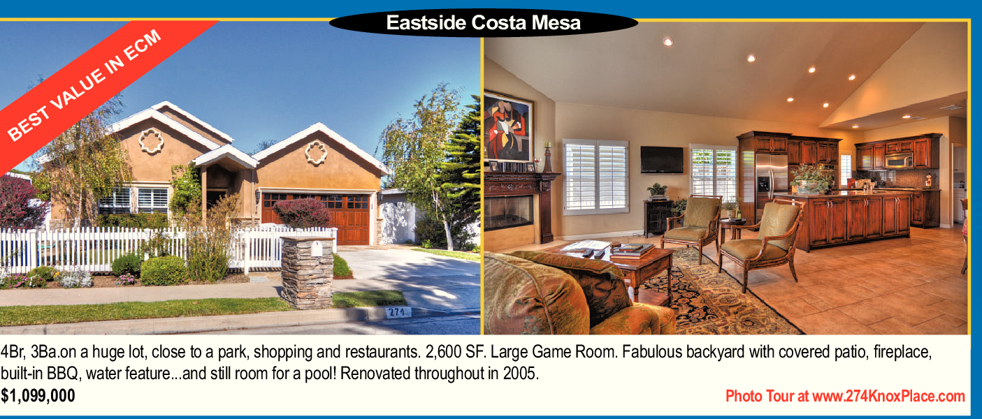Eastside Costa Mesa 4Br, 3Ba.on a huge lot, close to a park, shopping and restaurants. 2,600 SF. Large Game Room. Fabulous backyard with covered patio, fireplace, built-in BBQ, water feature...and still room for a pool! Renovated throughout in 2005. $1,099,000 Photo Tour at www.274KnoxPlace.com