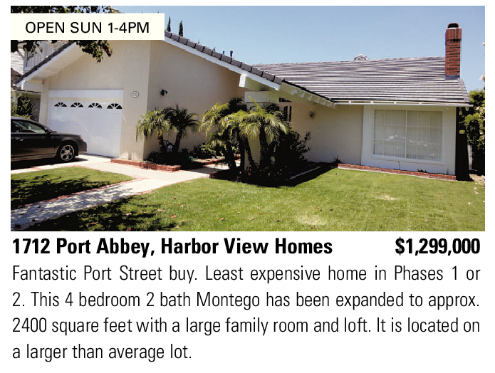 OPEN SUN 1-4PM 1712 Port Abbey, Harbor View Homes $1,299,000 Fantastic Port Street buy. Least expensive home in Phases 1 or 2. This 4 bedroom 2 bath Montego has been expanded to approx. 2400 square feet with a large family room and loft. It is located on a larger than average lot. See also