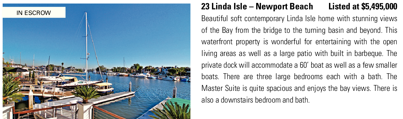 IN ESCROW 23 Linda Isle – Newport Beach Listed at $5,495,000 Beautiful soft contemporary Linda Isle home with stunning views of the Bay from the bridge to the turning basin and beyond. This waterfront property is wonderful for entertaining with the open living areas as well as a large patio with built in barbeque. The private dock will accommodate a 60’ boat as well as a few smaller boats. There are three large bedrooms each with a bath. The Master Suite is quite spacious and enjoys the bay views. There is also a downstairs bedroom and bath.