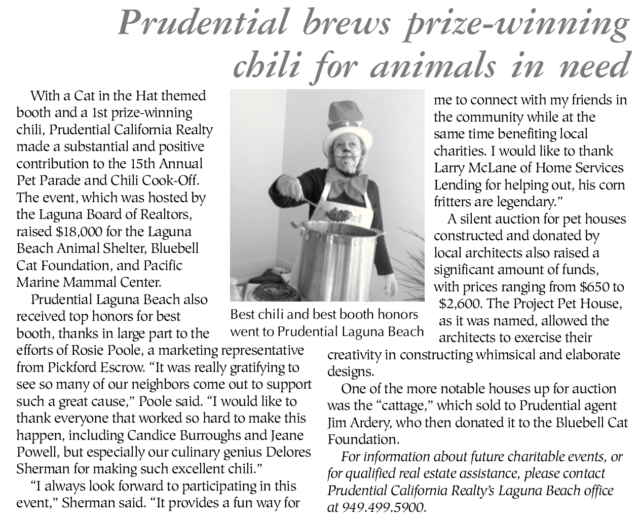 With a Cat in the Hat themed booth and a 1st prize-winning chili, Prudential California Realty made a substantial and positive contribution to the 15th Annual Pet Parade and Chili Cook-Off. The event, which was hosted by the Laguna Board of Realtors, raised $18,000 for the Laguna Beach Animal Shelter, Bluebell Cat Foundation, and Pacific Marine Mammal Center.