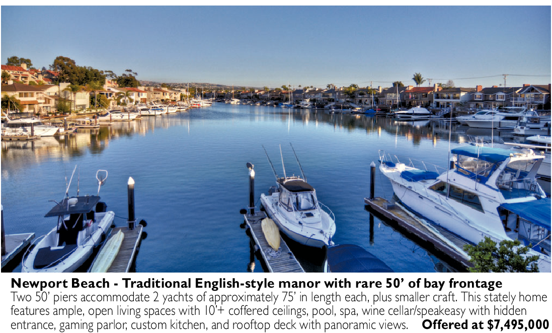 Newport Beach - Traditional English-style manor with rare 50’ of bay frontage Two 50’ piers accommodate 2 yachts of approximately 75’ in length each, plus smaller craft. This stately home features ample, open living spaces with 10’+ coffered ceilings, pool, spa, wine cellar/speakeasy with hidden entrance, gaming parlor, custom kitchen, and rooftop deck with panoramic views. Offered at $7,495,000