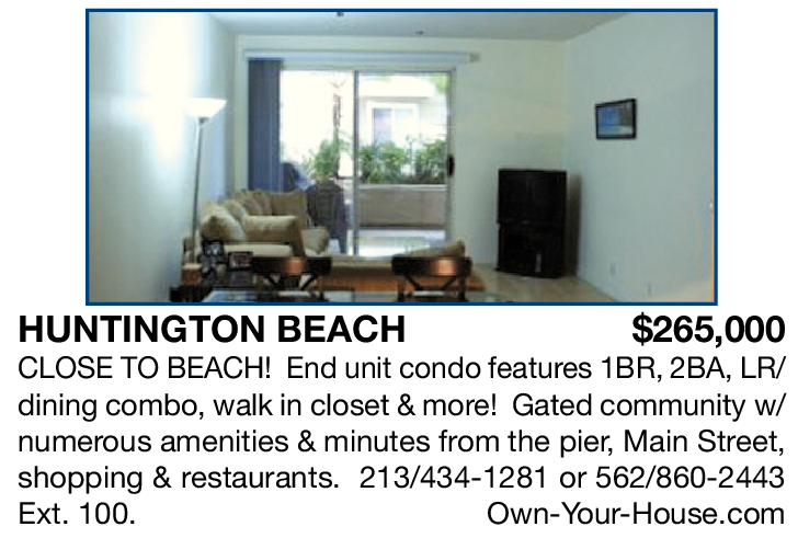HUNTINGTON BEACH $265,000 CLOSE TO BEACH! End unit condo features 1BR, 2BA, LR/ dining combo, walk in closet & more! Gated community w/ numerous amenities & minutes from the pier, Main Street, shopping & restaurants. 213/434-1281 or 562/860-2443 Ext. 100. Own-Your-House.com