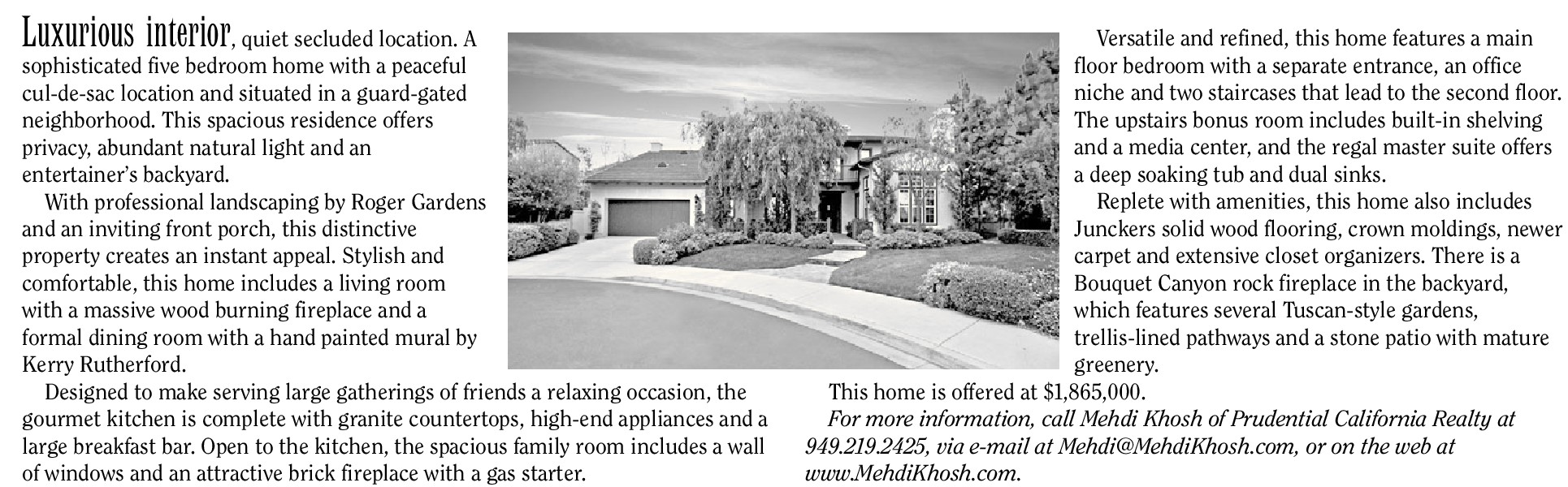 This home is offered at $1,865,000. For more information, call Mehdi Khosh of Prudential California Realty at 949.219.2425, via e-mail at Mehdi@MehdiKhosh.com, or on the web at www.MehdiKhosh.com.