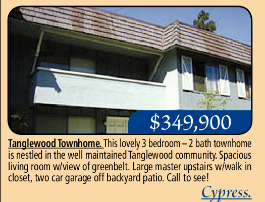 $349,900 Tanglewood Townhome. This lovely 3 bedroom – 2 bath townhome is nestled in the well maintained Tanglewood community. Spacious living room w/view of greenbelt. Large master upstairs w/walk in closet, two car garage off backyard patio. Call to see! Cypress.