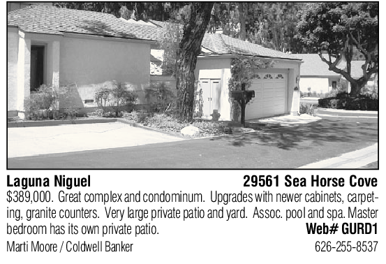 Laguna Niguel 29561 Sea Horse Cove $389,000. Great complex and condominum. Upgrades with newer cabinets, carpeting, granite counters. Very large private patio and yard. Assoc. pool and spa. Master bedroom has its own private patio. Web# GURD1 Marti Moore / Coldwell Banker 626-255-8537