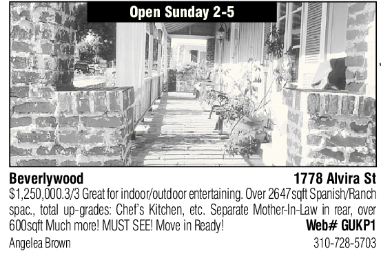 Open Sunday 2-5 Beverlywood 1778 Alvira St $1,250,000.3/3 Great for indoor/outdoor entertaining. Over 2647sqft Spanish/Ranch spac., total up-grades: Chef’s Kitchen, etc. Separate Mother-In-Law in rear, over 600sqft Much more! MUST SEE! Move in Ready! Web# GUKP1 Angelea Brown 310-728-5703
