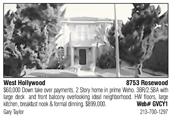 West Hollywood 8753 Rosewood $60,000 Down take over payments. 2 Story home in prime Weho. 3BR/2.5BA with large deck and front balcony overlooking ideal neighborhood. HW floors, large kitchen, breakfast nook & formal dinning. $899,000. Web# GVCY1 Gary Taylor 213-700-1297
