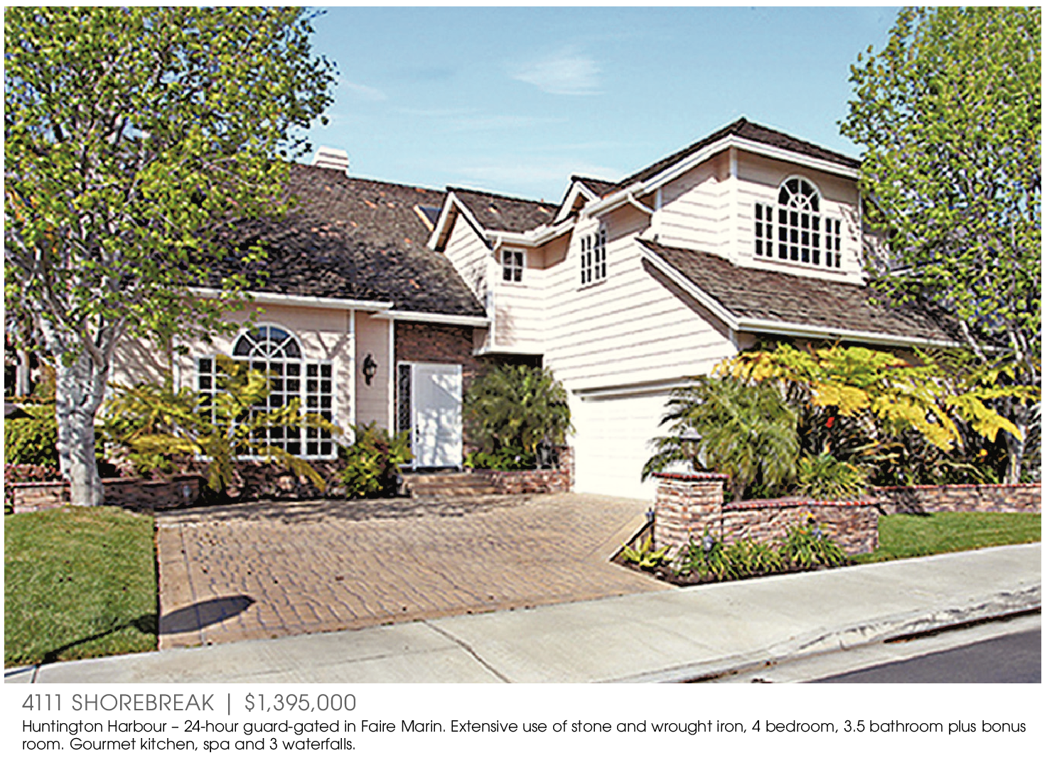 4111 SHOREBREAK | $1,395,000 Huntington Harbour – 24-hour guard-gated in Faire Marin. Extensive use of stone and wrought iron, 4 bedroom, 3.5 bathroom plus bonus room. Gourmet kitchen, spa and 3 waterfalls.