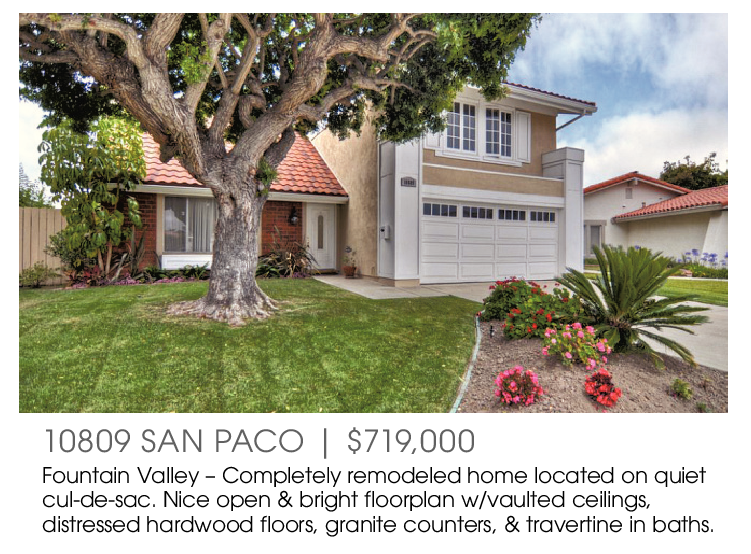 10809 SAN PACO | $719,000 Fountain Valley – Completely remodeled home located on quiet cul-de-sac. Nice open & bright floorplan w/vaulted ceilings, distressed hardwood floors, granite counters, & travertine in baths.