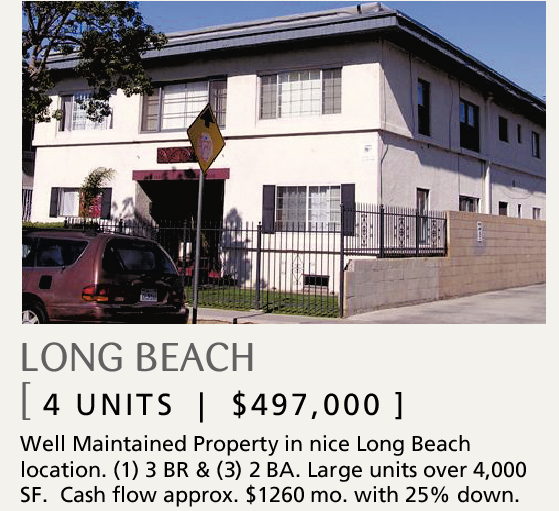 Well Maintained Property in nice Long Beach location. (1) 3 BR & (3) 2 BA. Large units over 4,000 SF. Cash flow approx. $1260 mo. with 25% down.