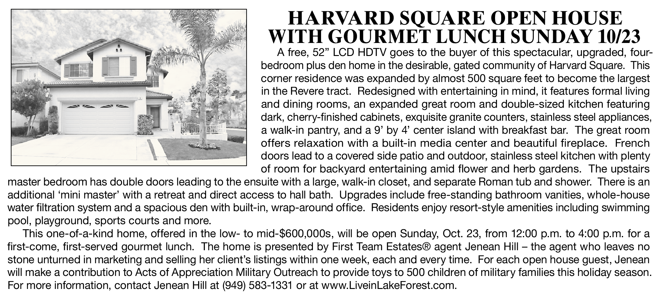 HARVARD SQUARE OPEN HOUSE WITH GOURMET LUNCH SUNDAY 10/23 A free, 52” LCD HDTV goes to the buyer of this spectacular, upgraded, fourbedroom plus den home in the desirable, gated community of Harvard Square. This corner residence was expanded by almost 500 square feet to become the largest in the Revere tract. Redesigned with entertaining in mind, it features formal living and dining rooms, an expanded great room and double-sized kitchen featuring dark, cherry-finished cabinets, exquisite granite counters, stainless steel appliances, a walk-in pantry, and a 9’ by 4’ center island with breakfast bar. The great room offers relaxation with a built-in media center and beautiful fireplace. French doors lead to a covered side patio and outdoor, stainless steel kitchen with plenty of room for backyard entertaining amid flower and herb gardens. The upstairs master bedroom has double doors leading to the ensuite with a large, walk-in closet, and separate Roman tub and shower. There is an additional ‘mini master’ with a retreat and direct access to hall bath. Upgrades include free-standing bathroom vanities, whole-house water filtration system and a spacious den with built-in, wrap-around office. Residents enjoy resort-style amenities including swimming pool, playground, sports courts and more. This one-of-a-kind home, offered in the low- to mid-$600,000s, will be open Sunday, Oct. 23, from 12:00 p.m. to 4:00 p.m. for a first-come, first-served gourmet lunch. The home is presented by First Team Estates® agent Jenean Hill – the agent who leaves no stone unturned in marketing and selling her client’s listings within one week, each and every time. For each open house guest, Jenean will make a contribution to Acts of Appreciation Military Outreach to provide toys to 500 children of military families this holiday season. For more information, contact Jenean Hill at (949) 583-1331 or at www.LiveinLakeForest.com.