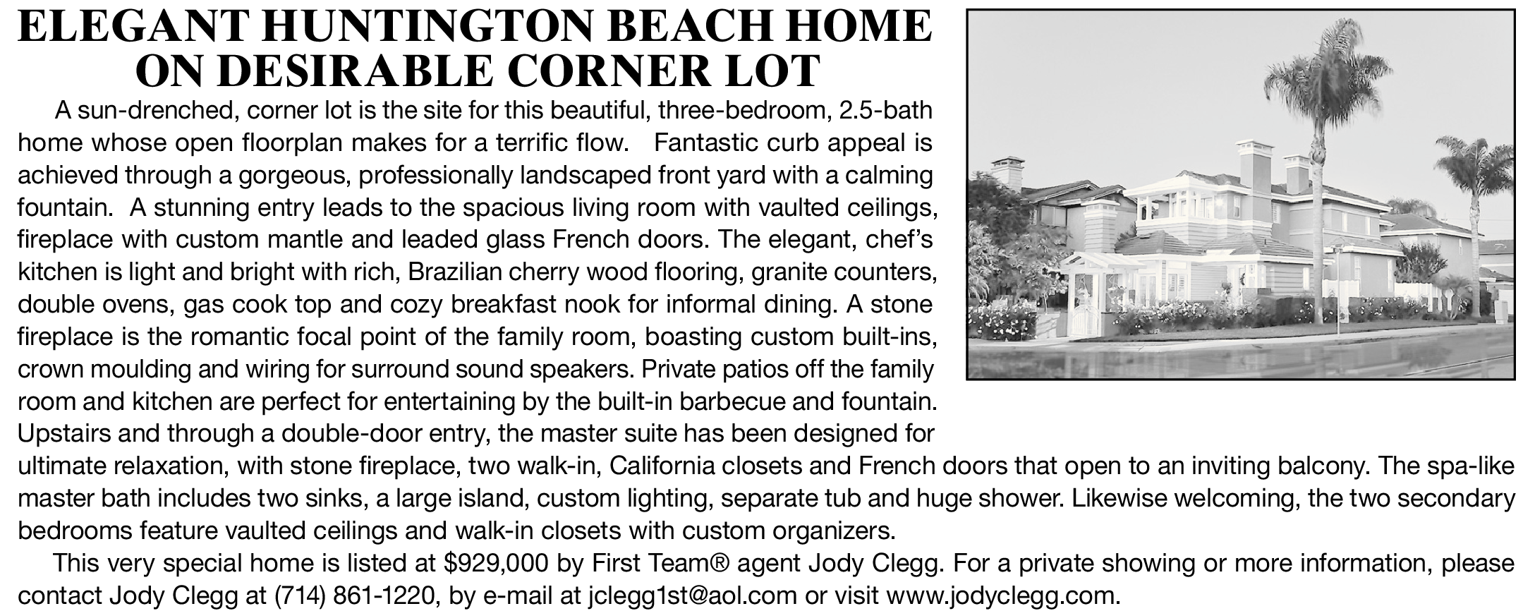 ELEGANT HUNTINGTON BEACH HOME ON DESIRABLE CORNER LOT A sun-drenched, corner lot is the site for this beautiful, three-bedroom, 2.5-bath home whose open floorplan makes for a terrific flow. Fantastic curb appeal is achieved through a gorgeous, professionally landscaped front yard with a calming fountain. A stunning entry leads to the spacious living room with vaulted ceilings, fireplace with custom mantle and leaded glass French doors. The elegant, chef’s kitchen is light and bright with rich, Brazilian cherry wood flooring, granite counters, double ovens, gas cook top and cozy breakfast nook for informal dining. A stone fireplace is the romantic focal point of the family room, boasting custom built-ins, crown moulding and wiring for surround sound speakers. Private patios off the family room and kitchen are perfect for entertaining by the built-in barbecue and fountain. Upstairs and through a double-door entry, the master suite has been designed for ultimate relaxation, with stone fireplace, two walk-in, California closets and French doors that open to an inviting balcony. The spa-like master bath includes two sinks, a large island, custom lighting, separate tub and huge shower. Likewise welcoming, the two secondary bedrooms feature vaulted ceilings and walk-in closets with custom organizers. This very special home is listed at $929,000 by First Team® agent Jody Clegg. For a private showing or more information, please contact Jody Clegg at (714) 861-1220, by e-mail at jclegg1st@aol.com or visit www.jodyclegg.com.