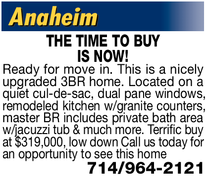 remodeled kitchen w/granite counters, master BR includes private bath area w/jacuzzi tub & much more. Terrific buy at $319,000, low down Call us today for an opportunity to see this home 714/964-2121