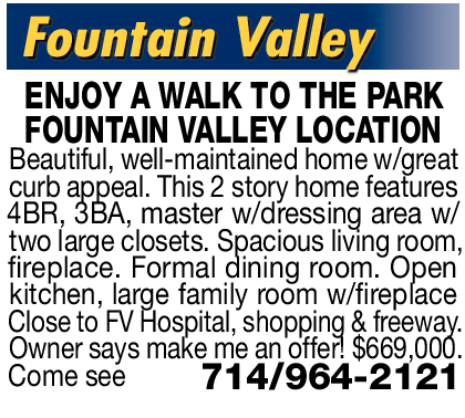 windows, counters, Fountain Valley ENJOY A WALK TO THE PARK FOUNTAIN VALLEY LOCATION Beautiful, well-maintained home w/great curb appeal. This 2 story home features 4BR, 3BA, master w/dressing area w/ two large closets. Spacious living room, fireplace. Formal dining room. Open kitchen, large family room w/fireplace Close to FV Hospital, shopping & freeway. Owner says make me an offer! $669,000. Come see 714/964-2121